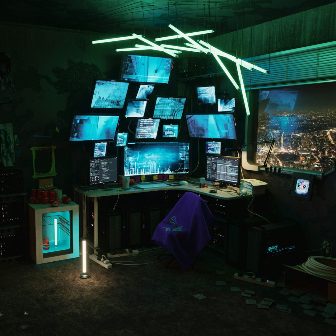 Immerse yourself in a visually striking cyberpunk-inspired space that inspires tech enthusiasts.